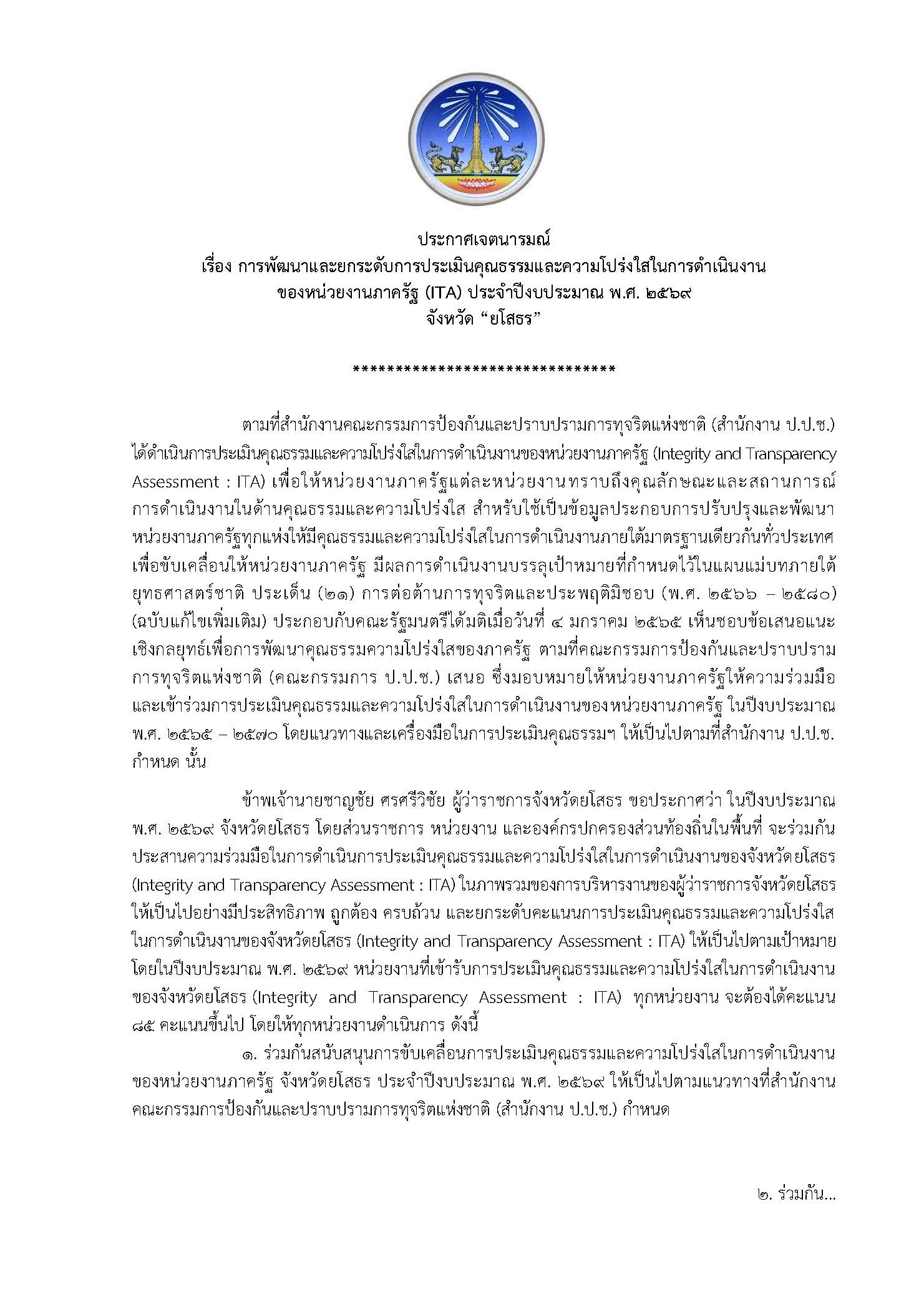 ประกาศเจตนารมณ์ เรื่อง การพัฒนาและยกระดับการประเมินคุณธรรมและความโปร่งใสในการดำเนินงานของหน่วยงาน (ITA) ประจำปีงบประมาณ พ.ศ. 2569 จังหวัดยโสธร