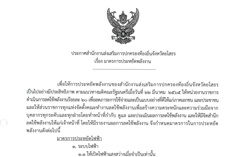 ประกาศสำนักงานส่งเสริมการปกครองท้องถิ่นจังหวัดยโสธร เรื่อง มาตรการประหยัดพลังงาน
